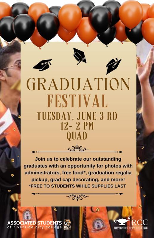 | Tuesday, June 3 | Graduation Festival Noon - 2 pm Quad Celebrate our amazing graduates at GradFest with free food*, photo opportunities with administrators, graduation regalia pickup, cap decorating, and more — all free for students while supplies last. Graduation Festival Flyer |